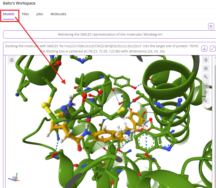 Once docking is complete, you can visualize each docked pose and overlay it with the crystal ligand by asking Balto to display docked poses. Alternatively, click the “Show models” button to review each docked pose in full-screen mode.